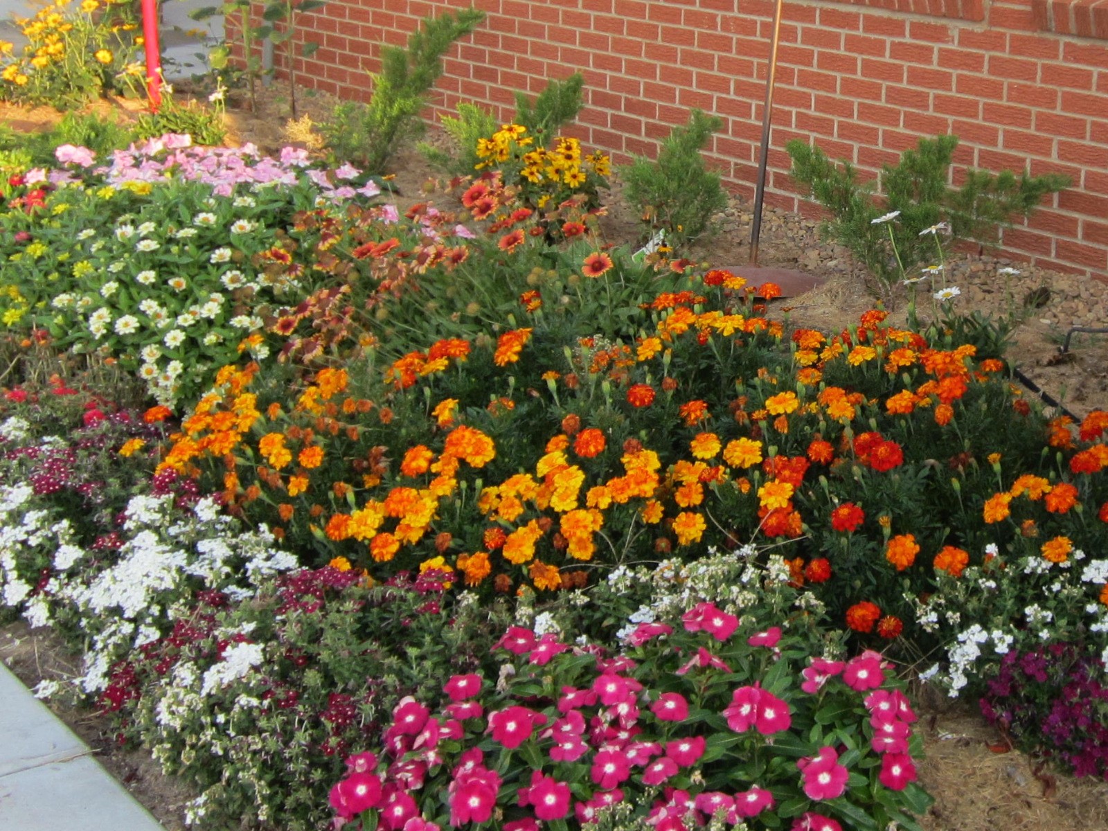 Throughout the summer, one idea led to another. Many people helped make it possible: a nearby greenhouse gave permission to use of their mound of discarded potting soil to mix in with the poor clayish dirt we had and a nearby farmer used his tractor to transport two huge scoops of it. My dad tilled it in, a friend gave me some seeds, the roadsides offered their wildflowers, and home flowerbeds offered others. And of course, greenhouses gladly sold both flowers and vegetables. It was such fun!