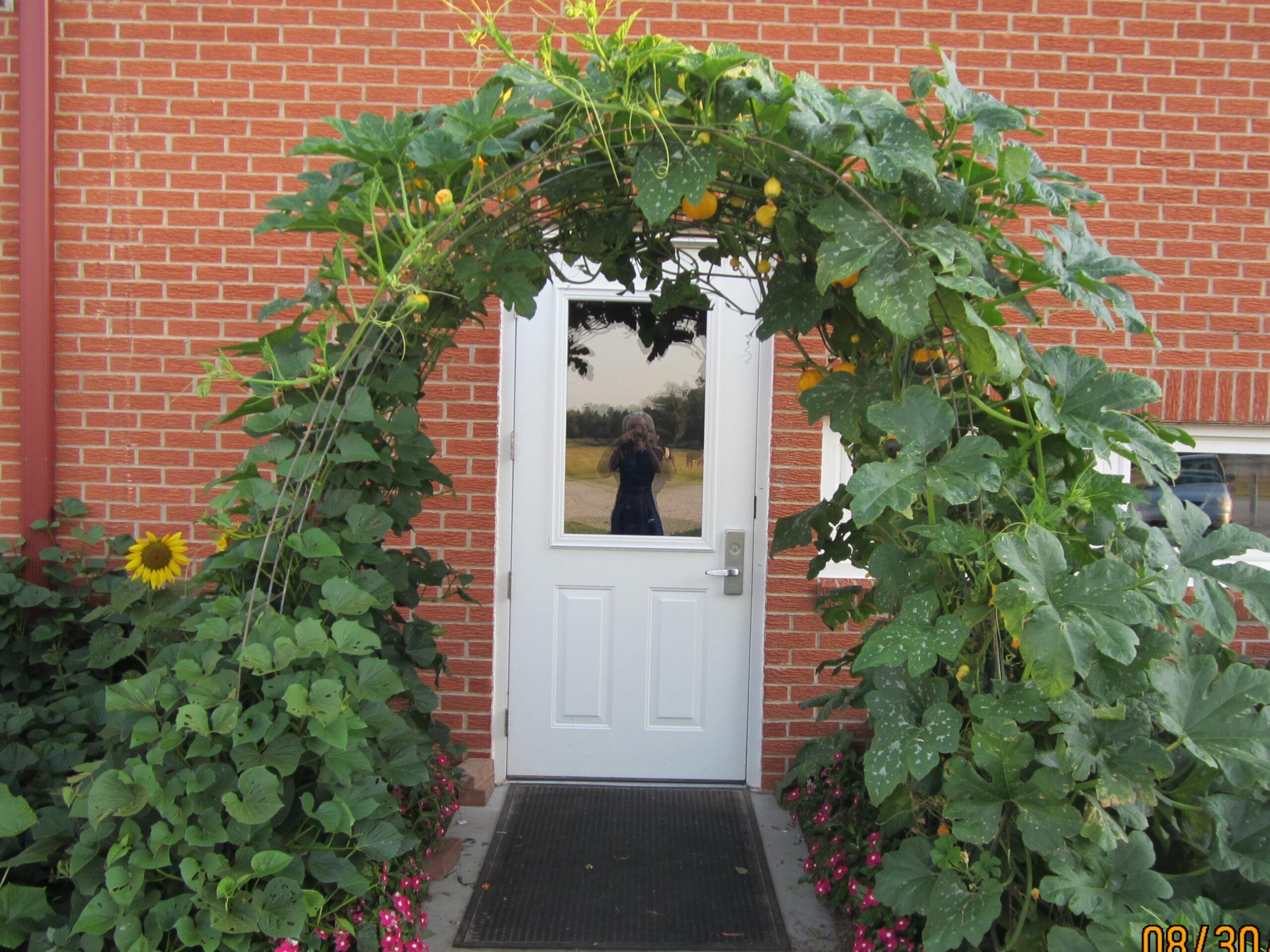 When the vigorous vines of the ornamental squash refused to stay in their designated area, my dad erected a rustic arch (made of a cattle panel) in front of the 1st and 2nd grade classroom door and the vines promptly climbed to the summit before beginning their descent down the other side! Today as several of us ate our lunch outside under the shade of this archway, I counted 26 little squash hanging down from the top and sides of the arch; there will be plenty of decorative squash for everyone to take home.