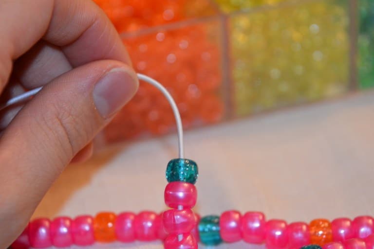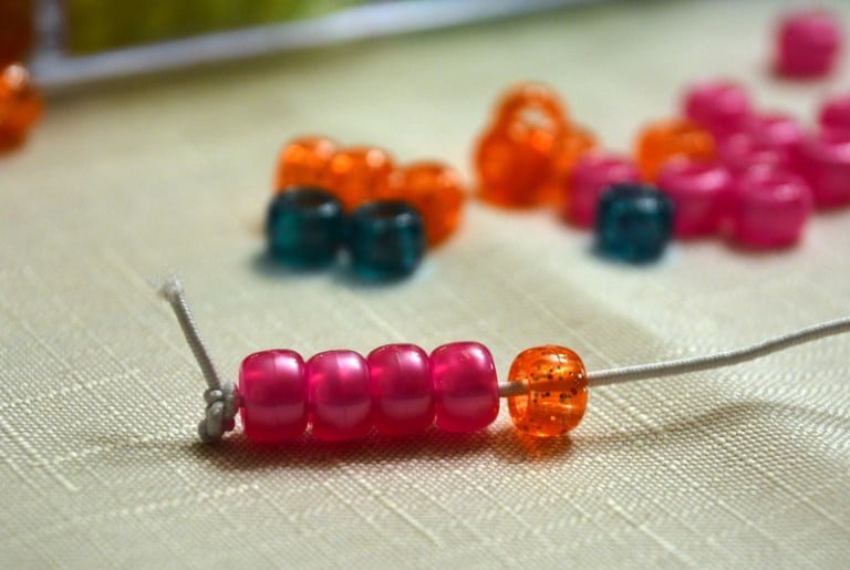 When the child is finished, tie a knot at the open end of the elastic. I like to leave a little bit of extra space for sliding beads up and down the string or for dividing them into groups.