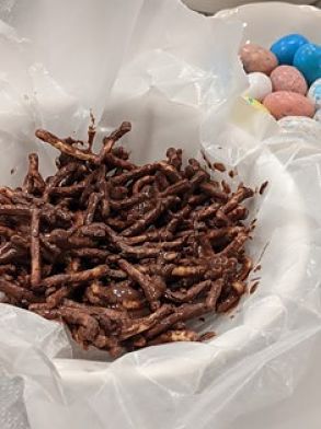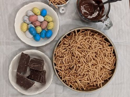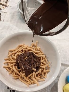 There are a lot of options for nest materials. Considering that we use melted chocolate to hold the nest together, it is good to use something salty. Very thin pretzels would work, but we prefer chow mien noodles because they look just like little bent twigs. For a gluten-free option, there are potato sticks.