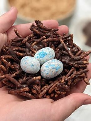 Of course, the nests need eggs. There are many candy eggs available. You can find large speckled jellybeans or Whoppers malted milk robin eggs.