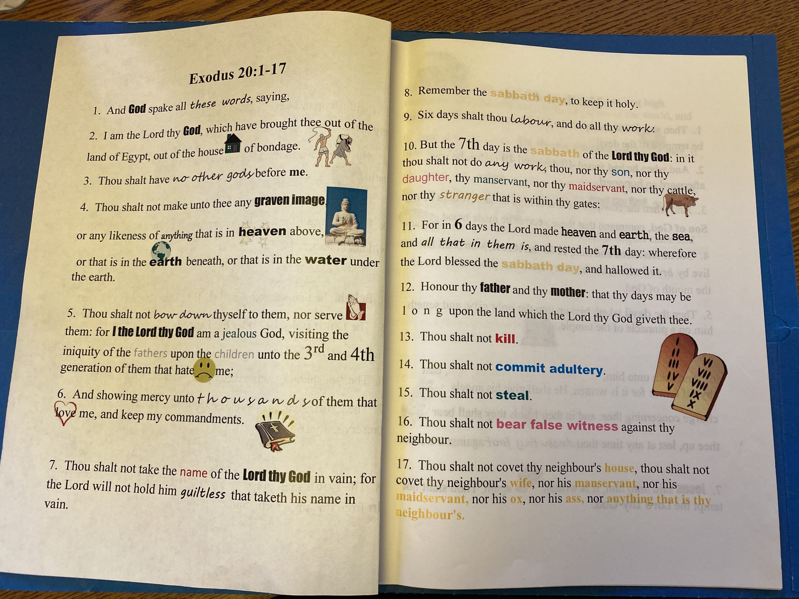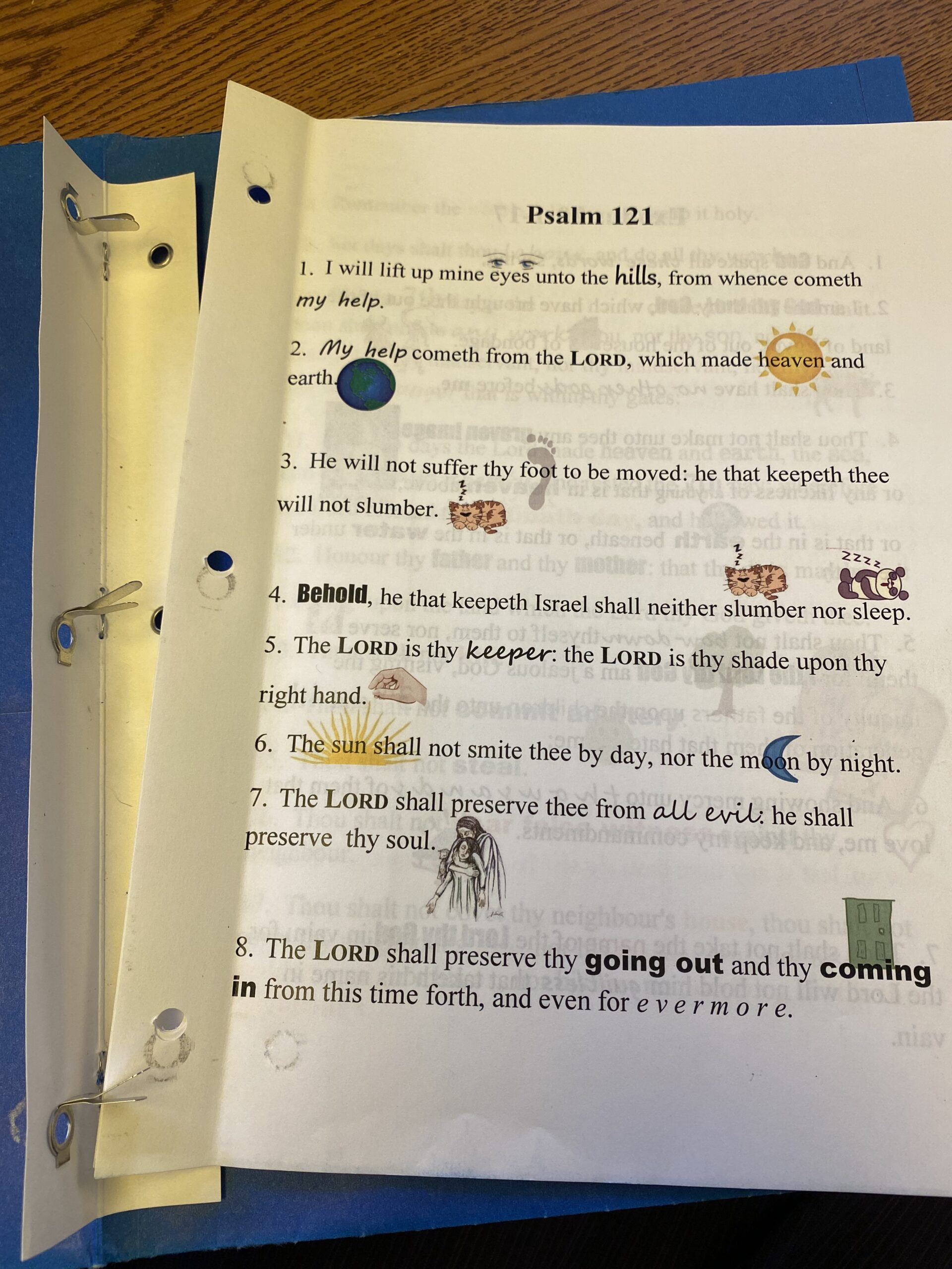 Some of you know all too well the excruciating, time-stealing frustration of listening to students try to recite their Bible Memory to you when they really don’t know it. Over the years, I have learned to implement various practices that have resulted in most of my third graders being able to recite their Bible Memory quickly with few or no mistakes. First of all, at the beginning of the year I print out the year’s memory passages and put them in a binder folder for each of the students to use throughout the year. To aid the visual learners, I include clip art and use various colors and fonts for the text (see photos below).