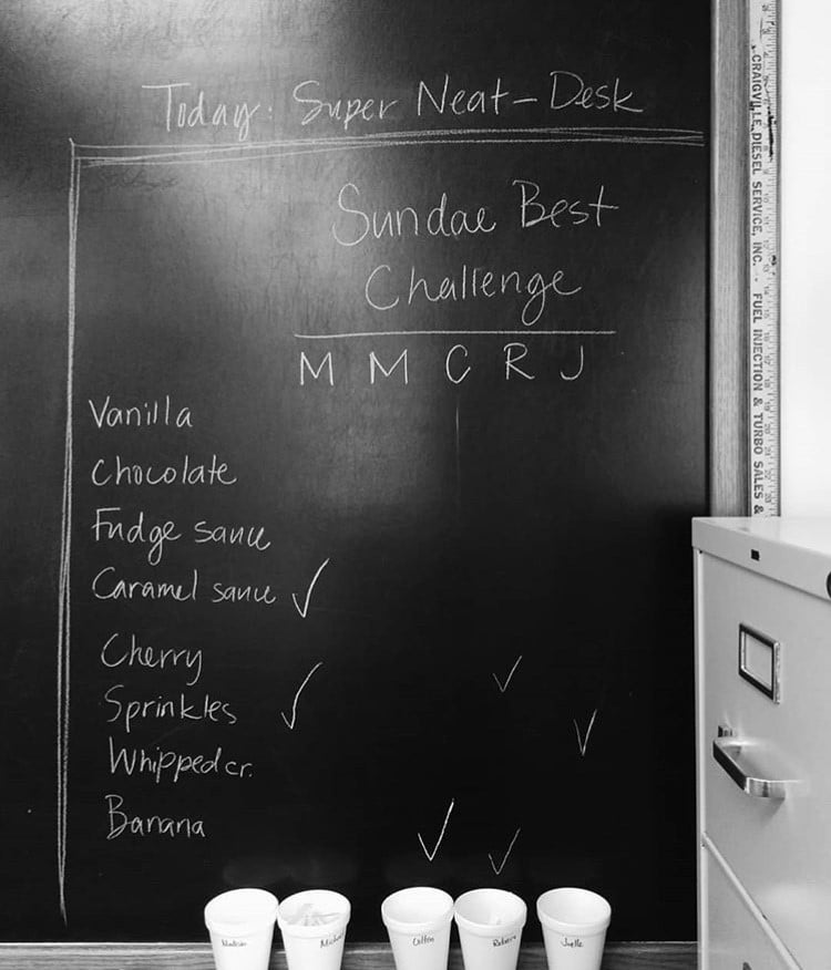 Each day has a separate challenge. These include things like neat seatwork, tidy desks, and not missing more than ___ on a math page. I repeated some challenges. Once they completed the day’s challenge, they could draw a slip from their cup. Each person’s cup had the same riddles in it. The riddle led them to a certain object where I had hidden a word. For example, “The more I dry, the wetter I become?” led them to the paper towel holder in the classroom. Hidden there was an ingredient to their sundae or taco. Once they’d found the word, they could add that ingredient to their menu.