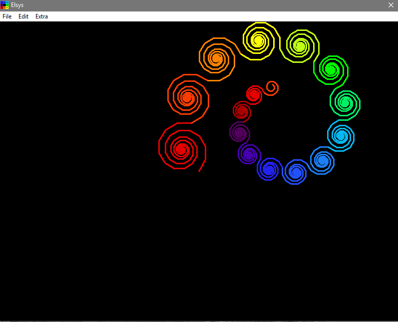 Elsys uses commands in L-systems to draw geometric designs. L-systems enable us to use relatively few commands to produce complex shapes. To learn more about L-systems, select one of the options in the "Extra" menu. To see the commands for the current L-system, select "Show L-system Text" in the "Edit" menu. For your first experiments with L-systems, select "L-system Order" in the "Edit" menu. Then carefully observe the number of the current order and type in a smaller order.