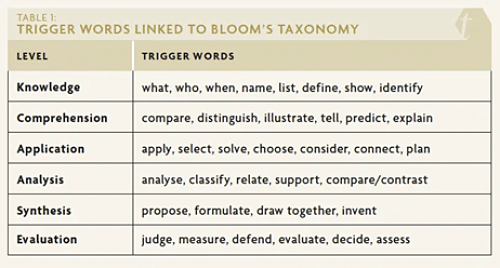 Looking at Bloom’s Taxonomy (table below) can help in developing higher-level questions. The words in the taxonomy can be used to plan quality questions and aid in higher level thinking. On the Evaluation level, use the “trigger words” to create questions of assessing, evaluating, or defending. You can ask students to support their answers with evidence from the text, as on the Analysis level.