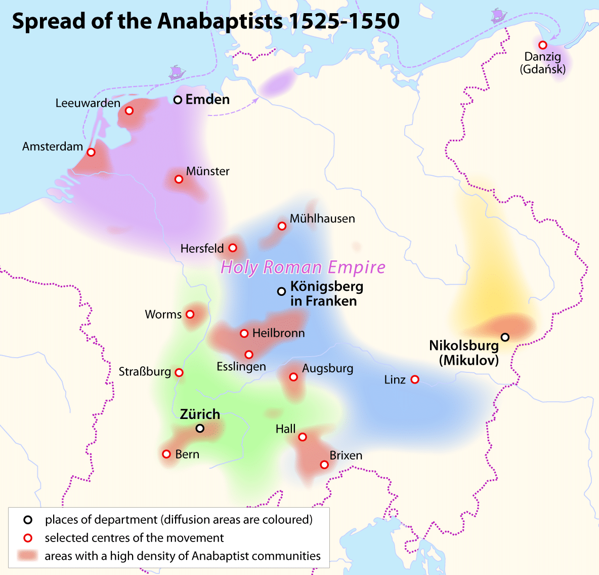 Map showing the areas where most Anabaptist groups lived in Europe in 1525-1550.