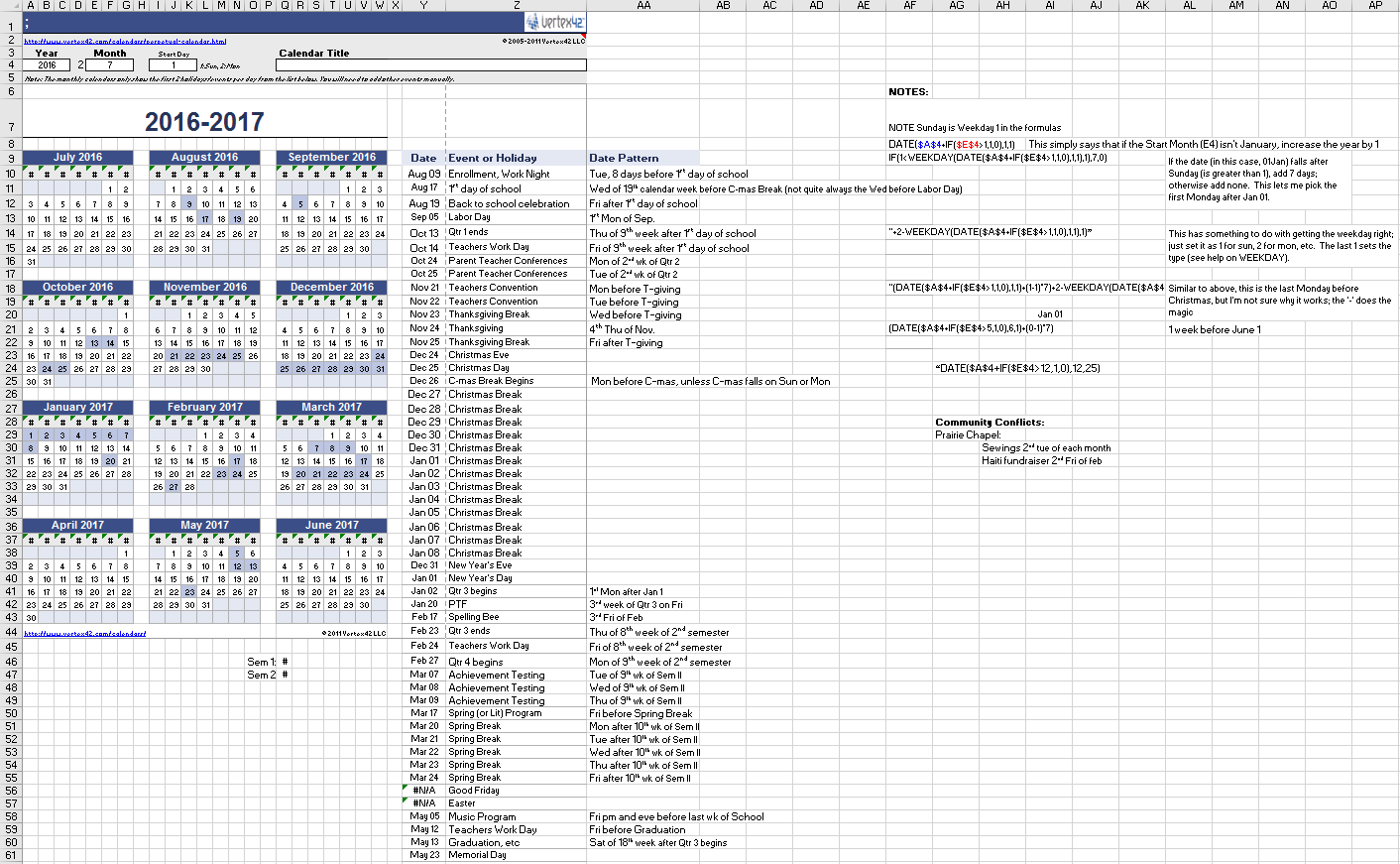This is a screen grab of an example calendar created by Pilgrim Christian School. Due to copyright, we cannot provide the spreadsheet file itself on our site, but it can be freely downloaded in Excel and Open Office formats from Vertex42.