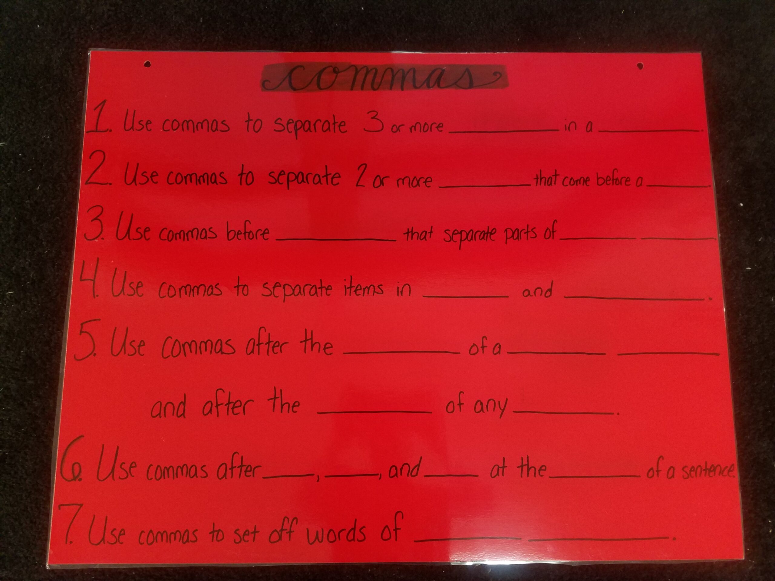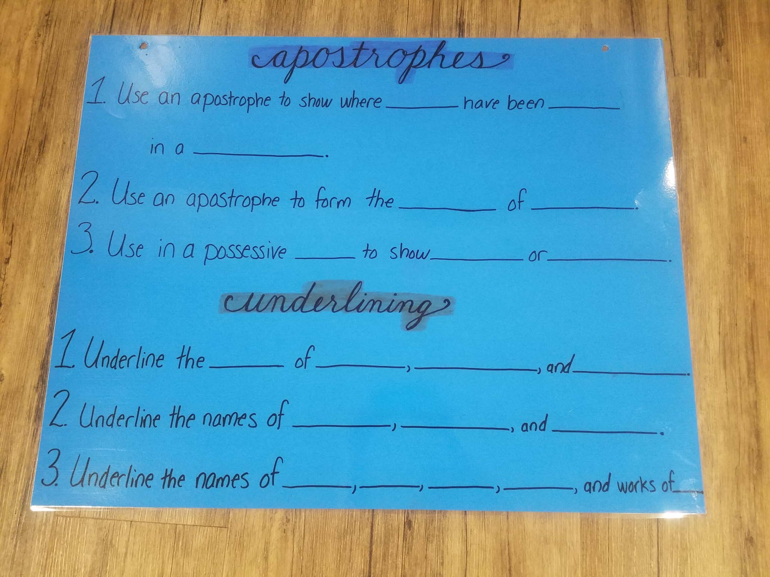 These images show the laminated posters where students write rules about apostrophes, underlining, capitalization, and commas.
