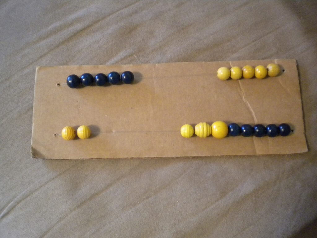 Make Your OwnIt's easy to create your own rekenreks, although a bit time consuming, so enlisting a few friends or a teacher's aide is a benefit. With some cardboard, fish line, large beads, and hot glue, you can create your own stash. (You never know what might be lurking in the corners of your school's supply closet!). Poke two holes on each side of the rekenrek. Thread a needle with fish line, poke it through the hole on the right side, string the beads, and finally poke it through the hole on the left. Tie the ends of the fish line securely in the back of the rekenrek and add a bit of hot glue to hold the knot. Fish line seems to be fairly durable and hot glue holds the knots in place so that your rekenreks stay intact.