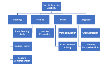 In broad terms, there are four main areas in which learning disabilities can occur—reading, writing, math, or oral language. Within these broad categories are 8 specific subtypes of SLD, and the areas of difficulty can be described as follows: