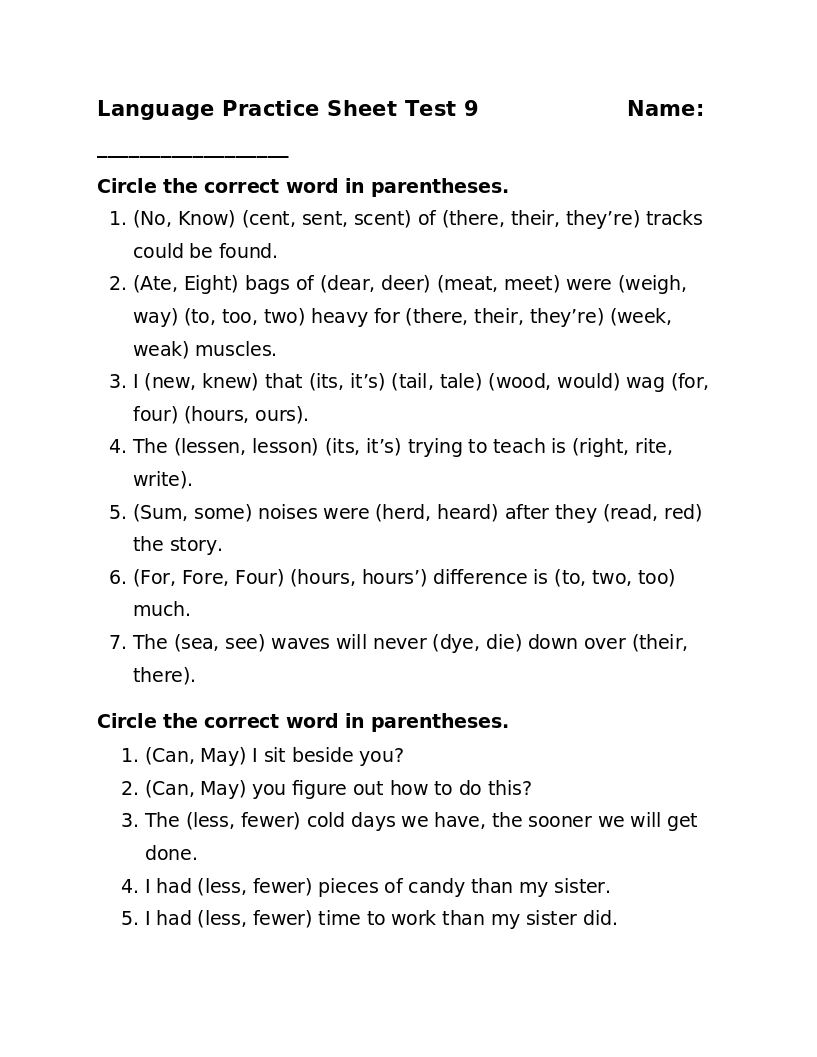A practice paper for A Beka Language Grade 5, Test 9. Students circle the correct homophones and identify the proper usage of can/may, less/fewer, among/between, and amount/number in sentences.