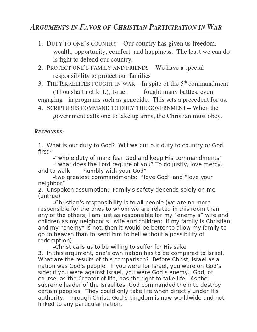 Teacher's notes giving four popular reasons Christians give for participating in war. Responses to these reasons including Bible verses are given.