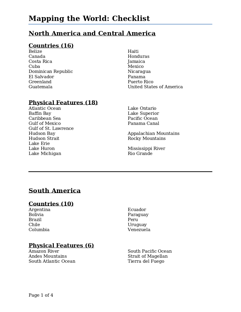 This checklist for the final project of drawing a world map lists the countries and physical features by continent that should be included in the maps drawn by each student.