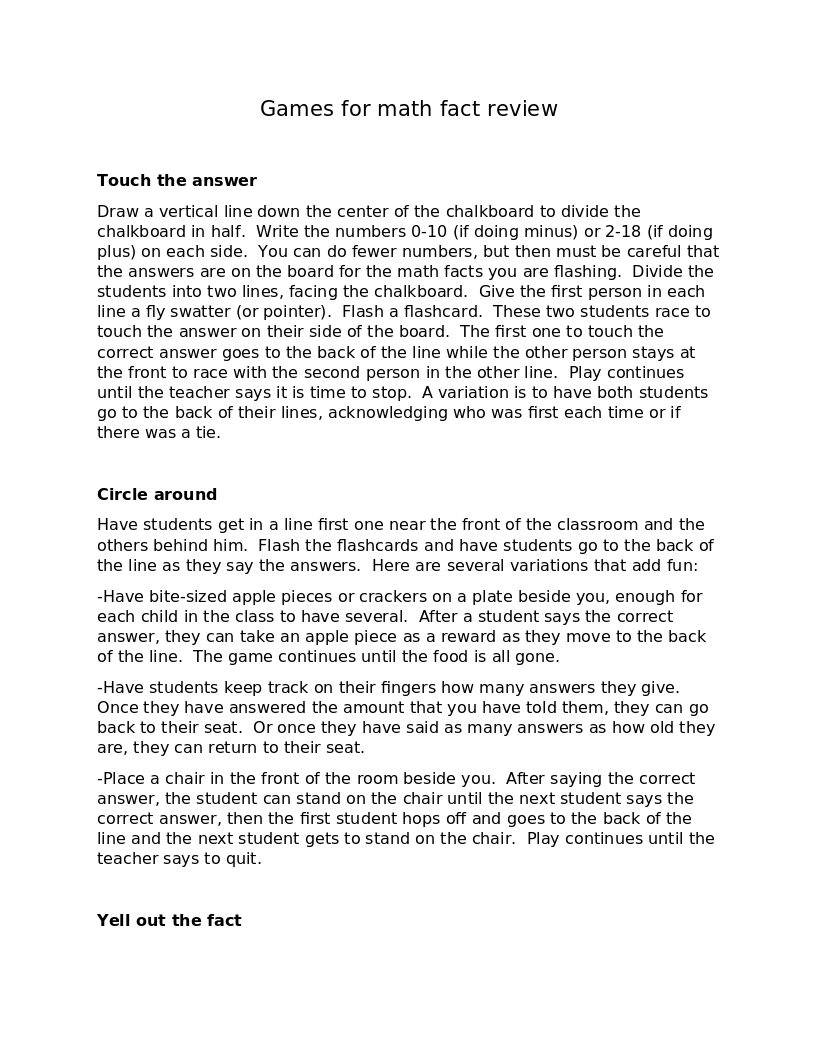 A variety of simple games to play in the classroom to review math facts. These work best in lower elementary but some could be adapted for middle grades.