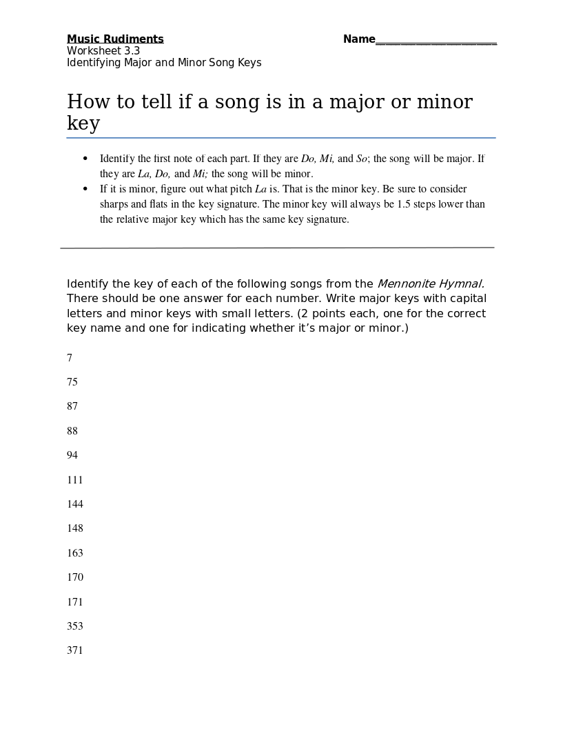 Worksheet 3.3 Identifying Major or Minor Keys of Songs